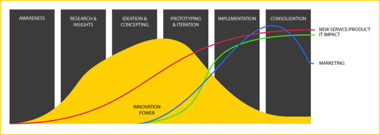 Veel bedrijven lukt het prima om met nieuwe business modellen, producten of diensten te komen, al dan niet met hulp van externe specialisten maar het blijkt lastig om deze als volwaardig onderdeel van de bedrijfsvoering te maken. De vraag is natuurlijk hoe innovatie vormgegeven wordt binnen uw organisatie. In onderstaande grafiek ziet u in welke fase innovatiekracht het hardst nodig is. Gedurende het proces komt een nieuw product of service steeds meer tot zijn recht tot uiteindelijk de organisatie het omarmt in de consolidatie fase en de innovatiekracht in mindere mate aanwezig is. Uiteraard geldt dat een product of service altijd onder vernieuwing onderhevig is en innovatie altijd een rol blijft spelen om relevantie te garanderen.